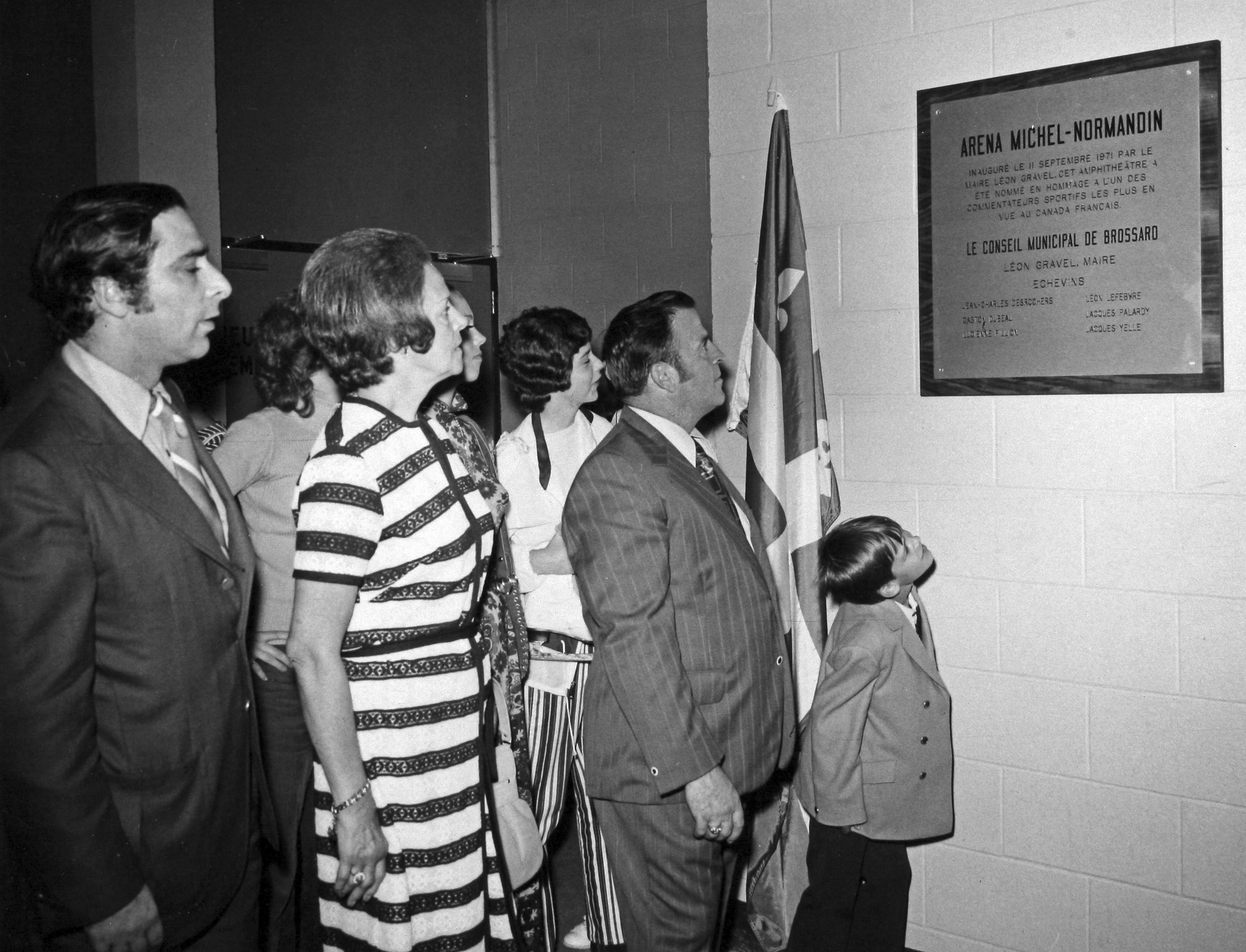 Maires; Députés; Inaugurations; Patinoires couvertes; Vêtements d’homme; Vêtements de femme; Drapeaux; Léon Gravel; Paul Berthiaume; Aréna Michel Normandin; Inauguré le 11 septembre 1971 par le maire Léon Gravel. Cet amphithéâtre a été nommé en hommage à l’un des commentateurs sportifs les plus en vue au Canada Français. Le conseil municipal de Brossard Léon Gravel, Maire, Échevins : Jean-Charles Desrochers, Léon Lefebvre, Gaston Dubeau, Jacques Palardy, Lucienne Filion, Jacques Yelle;